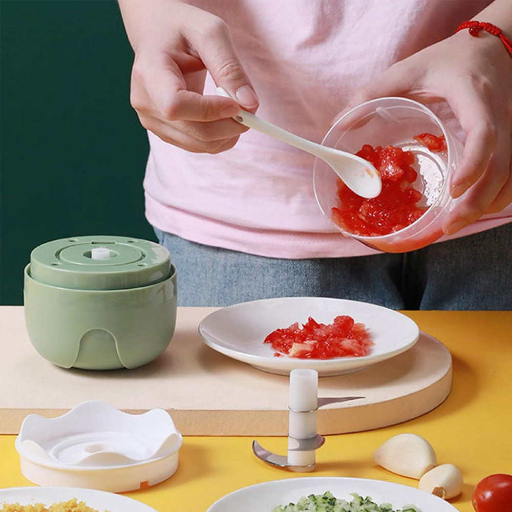 El mini triturador compacto, inalámbrico y recargable por USB es perfecto para cocinas pequeñas o portátiles. Ahorra espacio y te acompaña a cualquier lugar, ideal para quienes cocinan frecuentemente.
